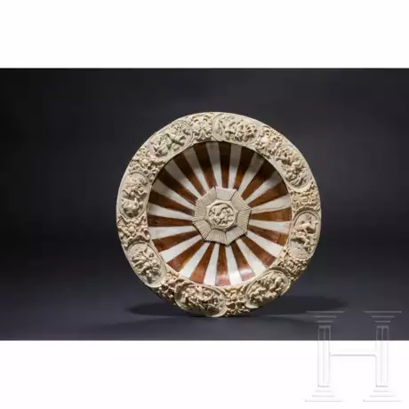 Teller aus Hirschhorn und Holz mit Elfenbeinauflagen. Im Zentrum des Spiegels reliefierte Darstellung eines Kriegers, der sein Opfer enthauptet, ein geflügeltes Pferd im Hintergrund. Leicht ansteigende Fahne, alternierend mit Holz und Elfenbeineinlagen gearbeitet sowie in Gravur bezeichnet "O.G" und datiert "1881". Breiter Rand mit stark reliefierter Elfenbeinauflage. Insgesamt acht Ovalkartuschen mit sehr detailliert gearbeiteten mythologischen Szenen. Zwischen den Kartuschen reliefierte Groteske, Tauben und Fruchtbouquets. Am äußeren Rand fehlt ein Stück der Elfenbeinauflage, ansonsten nur kleine Fehlstellen und Risse. Insgesamt guter Zustand. Durchmesser 29,5 cm.