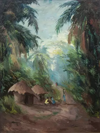 Los 157 | "Afrikanische Dorfszene in idyllischer Landschaft ", Öl/ Lw., undeutl. sign. u.l., 100x70 cm, Rahmen