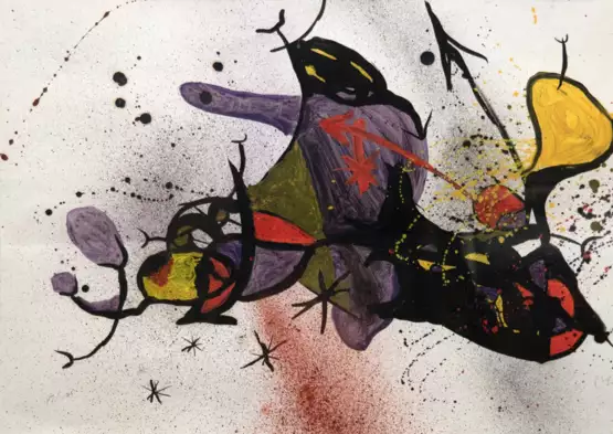 Los 216 | "Modern Abstrakt", Litho mit Acrylfarbe gehöht, in der Art von Miro, 93/ 175, 39x55 cm, im Passepartout hinter Glas und Rahmen
