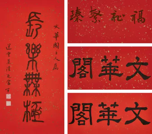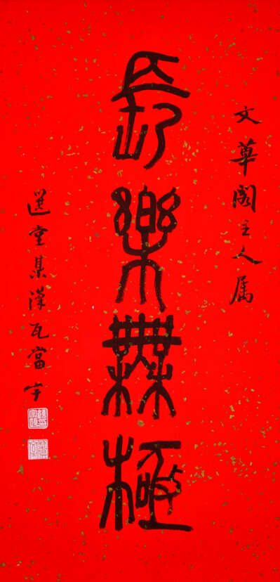 Scroll, mounted and framed, ink on gold-flecked red paper