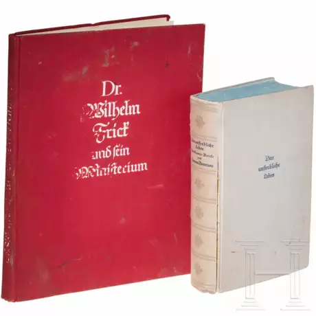 "Dr. Wilhelm Frick und sein Ministerium" mit rotem, weiß bedrucktem Leineneinband (angeschmutzt), Zentralverlag 1937. Auf dem Vorsatzblatt große eigenhändige Tintensignatur "Frick". "Das unsterbliche Leben" mit hellgrauem Leineneinband (am Rücken eingerissen), Diederich-Verlag Jena 1939. Auf dem Vorsatzblatt Stempel "Reinhard Heydrich" und handschriftlich "7.II.44 von Reichsleiter Bormann". Möglicherweise stammt die Notiz von Heydrichs Witwe Lina, die bis Kriegsende im Schloss bleiben durfte und weiterhin Geschenke der NS-Führungsriege erhielt.
