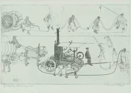 Stuttgarter Abfuhrwesen. 1911. Radierung. Unten rechts in Bleistift signiert. Unten links in Bleistift betitelt und im Druck monogrammiert und datiert. Plattengrösse 20,2x32,2 cm. Gerahmt.