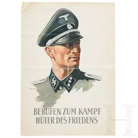 Ein Propagandaplakat der Waffen-SS, farbig lithographiert, Hochformat, gefaltet. Abgebildet ein SS-Offizier, Brustbild in Uniform, mit zweizeiliger Aufschrift "Berufen zum Kampf - Hüter des Friedens". Nach einem Entwurf von Ottomar Anton, im unteren Bereich beschriftet "Herausgegeben vom SS-Hauptamt, Berlin-Grunewald", im rechten unteren Bereich handschriftlich "29.02.1944". Maße ca. 83 x 58 cm. Insgesamt noch gut erhalten mit Altersspuren, einige Risse (u.a. mittig länglich) und Fehlstellen, fragiles Blatt. Sehr selten.