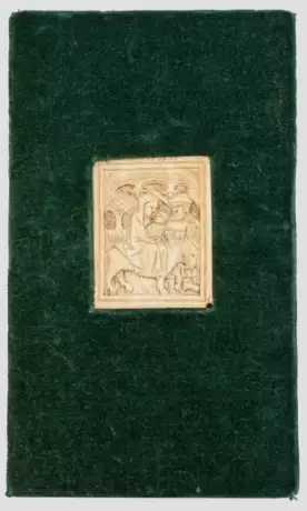 Elfenbein. Hochrechteckige Plakette mit reliefplastisch geschnitzter, szenischer Darstellung der Flucht der Hl. Familie nach Ägypten, umzogen von profiliertem Rahmen und gotischem Maßwerk. Maria reitet mit dem Jesuskind im Arm, auf einem von Josef geführten Esel durch eine grasbestandene Landschaft. Am Horizont ein Baum. 6,5 x 5 cm. Rahmen erg.; 20 cm x 11,5 cm.