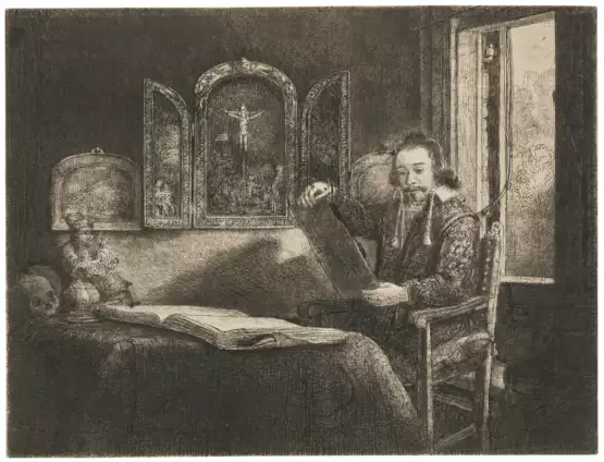Julius Rosenberg (1845-1900), Copenhagen (without stamp, see Lugt 1519); probably acquired from the above after the Artaria sale; his posthumous sale, C. G. Boerner, Leipzig, 1 May 1901, lot 220 ('Sehr schöner Abdruck des siebenten Zustandes mit dem Stichelglitscher auf der linken Wange, der Hut auf der Bank ist wenig sichtbar. Mit Rändchen, leicht eingetuscht. Aus Sammlung Artaria.') (Mk. 21; to Elischer).