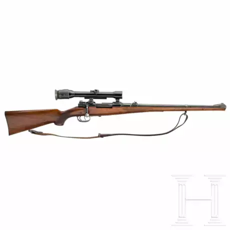 Kal. 7x57, Nr. 86, blanker Lauf, Länge 50 cm. Standkimme mit zusätzlicher Klappe und Perlkorn. System 98. Zusätzliche seitliche Greener-Sicherung. Klappdeckelmagazin mit Öffnungshebel. Deutscher Stecher. Stutzenschaft mit Fischhaut, Pistolengriff und deutscher Backe. Schaftkappe mit Mausertonne. Riemenbügel und Gewehrriemen. Montiert mittels SHM ein ZF Zeiss Zielvier Abs, 1. Länge102 cm.