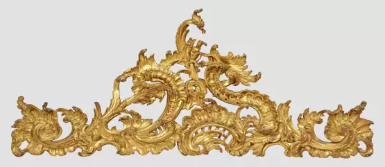 Holz, geschnitzt, gefasst und vergoldet. Geschweift ansteigender, asymmetrisch durchbrochen gearbeiteter Korpus aus plastisch gestalteten, üppigen Rocaillen, Muschel- und Blattwerk. Teilw. besch.; 76 cm x 183 cm.