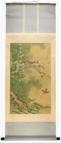 China, 20.Jh. Farbe auf Seide. Zhulin you qin, Vögel im Bambushain. Signiert Wang Ning mit rotem Siegel. Datiert 1984. 52x90 (Bildgrösse), 172x64 cm.