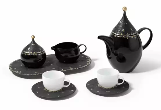 Ausführung seit 1968. Porzellan. Entwurf von Björn Wiinblad (Dekor und Form). Schwarze Biskuitreliefs mit figuralen Darstellungen, Schikaneders Text zu Mozarts "Zauberflöte" illustrierend. Goldstaffierung. Rückseitig mit Texten aus der "Zauberflöte" in goldener Schrift. Bestand: 1 Kaffeekanne, 1 Crémier und 1 Zuckerdose auf Présentoir, 6 Kaffeetassen mit Untertassen (H 4 cm). Total 10 Teile.