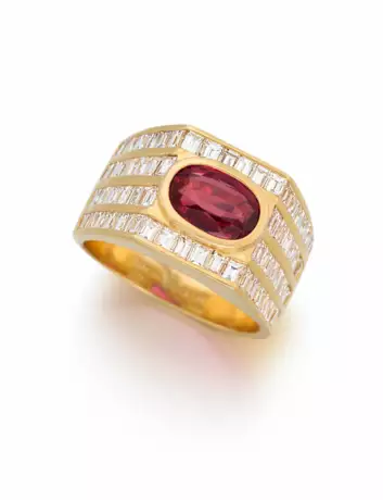Gemstones: 1 oval, faceted ruby ca. 1,2 ct., very transparent colour, lightly purplish.