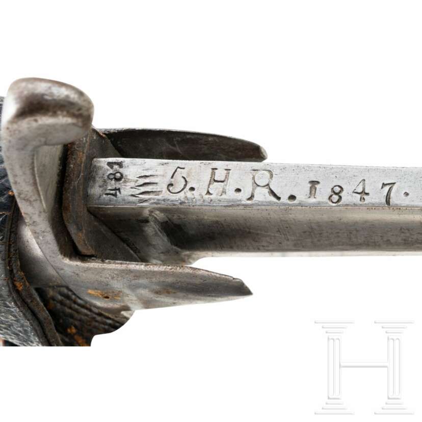 Nummerngleich. Breite, geschwungene Rückenklinge mit beidseitiger Hohlbahn und zweischneidiger Spitze (vereinzelt narbig), an der Wurzel der Hersteller "A.Werth" (halb verdeckt), am Rücken "5. H. R. 1847" (wohl Husaren-Regiment Nr. 5, Jahr 1847). Kräftiges eisernes Bügelgefäß mit Faustriemenschlitz und schwarz belederter Hilze, am quartseitigen Parierlappen der Truppenstempel "R.A.M. 6. 67". Schwere Eisenscheide mit zwei beweglichen Trageringen, oben der Truppenstempel "R.A.M. 6. 67". Anhängender schwarzer Faustriemen (beschädigt). Gefäß und Scheide (Rostspuren) mit gotischen Abnahmen. Partiell leicht beschädigt, Altersspuren. Länge 100 cm.