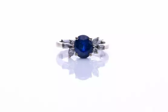 750 Weißgold, punziert, oval facettierter Saphir von sehr intensiver blauer Farbe, ca. 1,84 ct, oval geschliffen, Diamanten zus. ca. 0,31 ct, im Brillant-Schliff, Baguette-Schliff und Navette-Schliff, H, VSI-SI, Ringgröße 51, Gesamtgewicht ca. 4,2 g, Facettenkanten des Saphirs berieben, Tragespuren sichtbar