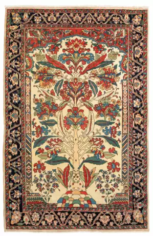 Z-Persien, um 1900. Unter einem roten Giebel liegt das weisse Hauptfeld, in dem ein farbenfroher, stilisierter Baum sich dekorativ über den gesamten Grund erstreckt, flankiert von filigran gezeichneten Blüten, Ranken, grosszügig gezeichneten Blättern und 2 stilvollen Säulen an den Seiten. 2 Rosettenborten säumen die elegante nachtblaue Wellenranken-Hauptbordüre, die einen aparten Rahmen bildet. Sehr gute Erhaltung. 142x218 cm (ft. 4.7x7.2).