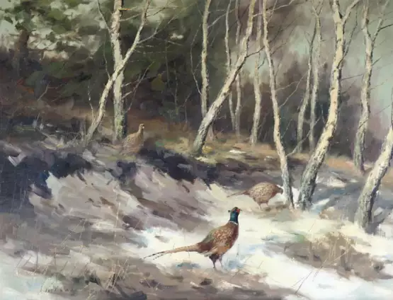 (1925 Bad Stepenitz - Meerbusch 2004). Waldstück mit Fasanenhahn u. 2 Hennen. Öl auf Lwd. 60 x 80 cm. Unt. li. sign. Gerahmt.