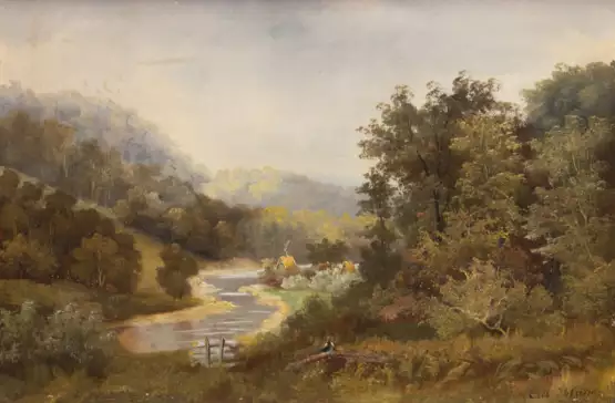 Los 138 | Schleichardt, C. (Maler 19./ 20. Jh.) "Hügelige Waldlandschaft mit Flußlauf", Öl/ Lw., sign. mit Ortsangabe "Düsseldorf 1896" u.r., 1 Hinterlegung, 46x65 cm, Rahmen