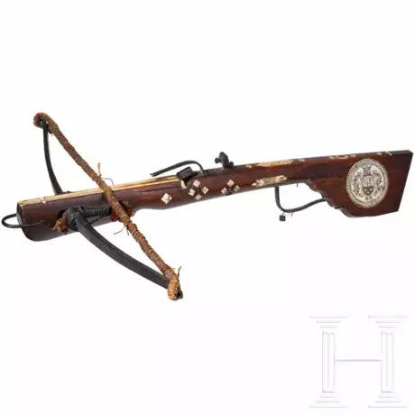Geschwärzter Stahlbogen, ungemarkt. Stabiler originaler Einbund, Hanfsehne (in der Gebrauchszeit ergänzt). Elegante Säule aus rötlich braunem Nussbaumholz (stellenweise Risse, Druckstellen) mit Intarsien aus poliertem, fein graviertem Geweih (einige wie am Wangenstück später ergänzt), vorne ein Eisenring für den Spannhebel. Beinerne Bolzenrinne, eiserner Bolzenhalter. Intaktes Klappenschloss mit Nadelstecher (Nadel gekürzt). Justierbares eisernes Visier mit offener Kimme. Intarsien teilweise in der späteren Gebrauchszeit ergänzt, so auch die Eisenbeschläge der Säule. Teilweise leicht beschädigt, Altersspuren. Bogenweite 57 cm, Gesamtlänge 70 cm.