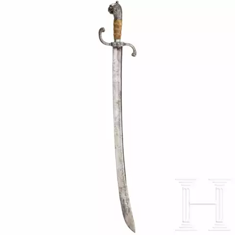 Schwere, leicht gekrümmte Rückenklinge mit breiter zweischneidiger Spitze und beidseitig doppelter Kehlung. Auf der gesamten Länge geätzter Zierdekor mit Darstellung von Schlangen, Sonne, Mond und Sternen sowie einem aus einer Wolke ragenden Arm mit Säbel. Ätzung stellenweise verputzt. Das reliefierte eiserne Gefäß wohl eine Zutat des Historismus. Parierstangenenden und Knauf in Löwenkopfform, Hilze mit Lederbezug über Schnurwicklung. Länge 100,5 cm.