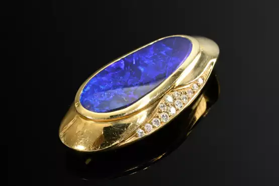 Schwerer Gelbgold 750 Anhänger in ovoider Form mit intensiv dunkelblauem Opal und 18 Brillanten (zus. ca. 0.25ct/VSI-SI/W), 15,8g, 3,3x1,6cm