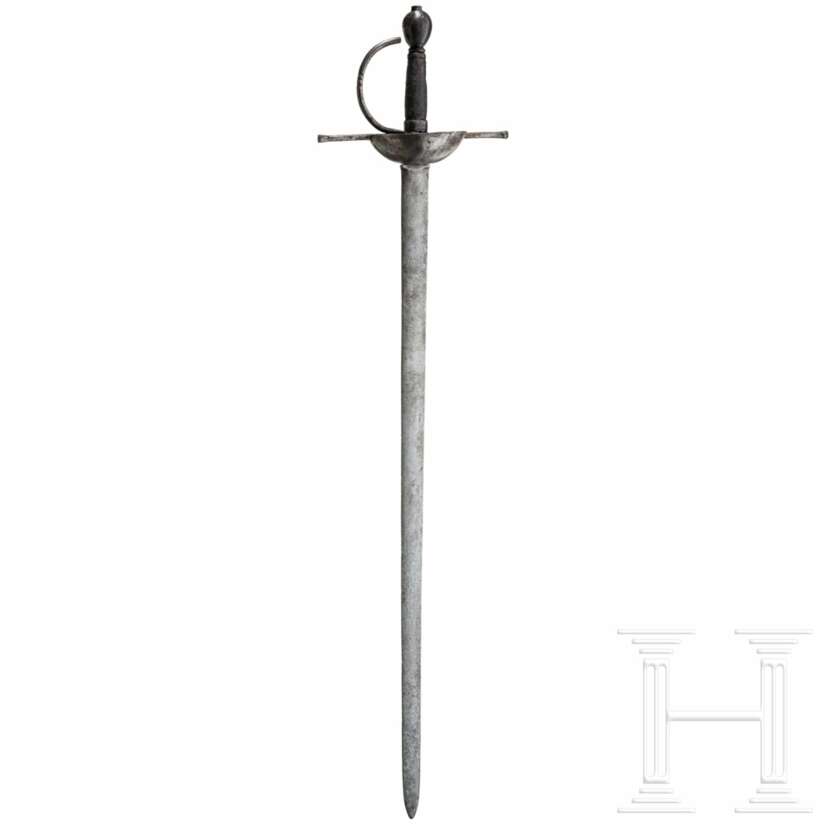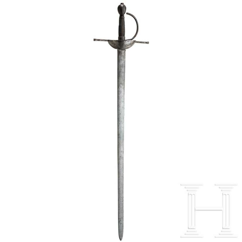 Schlanke, zweischneidige Klinge mit rhombischem Querschnitt. Kräftig gewölbte eiserne Glocke mit innenliegendem "Guarde de Polvo". Weit ausladende eiserne Parierstange mit Faustbügel und leicht verbreiterten Endknäufen. Hilze mit Resten des originalen Lederbezugs. Ovaler eiserner Knauf mit abgesetztem Vernietknauf. Länge 118 cm.