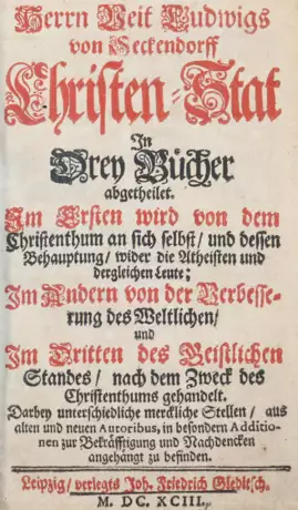 Vgl. Kistner-Seebaß 942 (nennt die 2. verb. Ausg. von 1686 als "einzige Ausgabe") u. Humpert 72 (EA 1685). - Seltene Ausgabe des staats- und religionspolitischen Spätwerkes Seckendorffs, mit umfangreichem (424 S.) Anhang ("Additiones"). - Gering gebräunt.