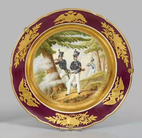 Runde, leicht vertiefte Form mit passig geschweiftem Rand. Im flächendeckenden, von einem schmalen, goldradierten Blütenkranz umzogenen Rand des Spiegels, in einem Waldstück stehende Soldaten mit Gewehren im Gefecht. Vergoldetes Steigbord. Auf der Fahne mit purpurfarbenem Fond fein goldradierte Militärtrophäen und alternierend der Doppeladler des Russischen Reichs. Polychrome Malerei. Rücks. in russisch bez., wohl „Soldaten von der Leibgarde. Finnisches Schützenbataillon“. Metallhalterung mit vergoldeten Tatzenfüßchen. Ausgeschliffene Manufakturmarke. D. 31 cm.
