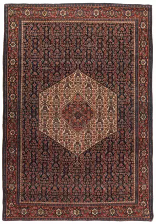 W-Persien, um 1920. Auf farbiger seidener Kette geknüpfter Teppich. Im nachtblauen Mittelfeld zeigt sich ein prächtiges weisses Hexagon, im Inneren mit einer roten Raute versehen, flankiert von einem durchgehend angelegten Senne-Streudekor in unendlichem Rapport. 3 Rosettenborten säumen die Hauptbordüre, die mit einem charakteristischen Senne-Dekor, Palmetten und Ranken verziert ist. Gute Erhaltung. 135x202 cm (ft. 4.5x6.7).