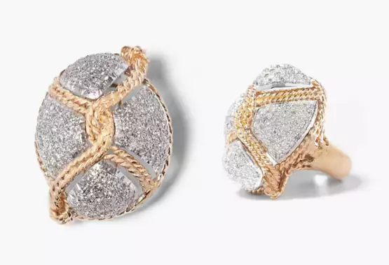 750 Gelb-/Weissgold. Bicolores bombiertes Ring- und Broschenmodell mit Seilmotiv. Weissgoldene Zwischenteile mit Brillanten pavégefasst ca. 1 ct. Gr. Ring 54, zus. 34 g.