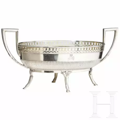 Silber, innen vergoldet. Auf vier Tatzenfüßen mit reliefierter Blattzier. Der untere Teil der Wandung godroniert. Der obere Teil der Wandung durchbrochen in Form von Girlanden gearbeitet. Beidseitig mit zwei verschiedenen bekrönten Allianzwappen. Zwei kantige Handhaben mit reliefierter Blattzier. Unterseite punziert mit Mondsichel, Krone, Feingehalt "800", Meistermarke und Juweliermarke "D.GADEBUSCH". Länge 43 cm, Gewicht 882 g.