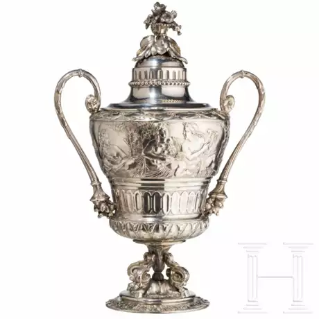 Silber, innen vergoldet. Runder Fuß mit reliefierter Blattzier. Die Kuppa umseitig mit reliefiertem Dekor gearbeitet: eine Seite mit den drei Grazien, die andere Seite mit antikisierendem Liebespaar mit Harfe und Putto. Zwei geschwungene Henkel mit plastischer Blattzier und Eicheln am unteren Ansatz. Steckdeckel mit Blütenknauf. Fuß, Kuppa und Deckel punziert mit Minervakopf. Höhe 27 cm, Gewicht 1225 g. Das Stück ist formgleich mit einer Vase aus einem Kaffee- und Teeservice von Odiot.
