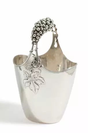 handle, a large, sculpted grape cluster with leaf tendrils extending to the sides.