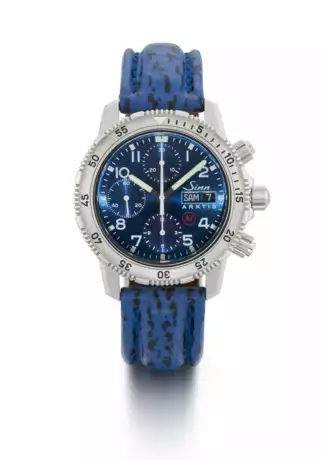 Case/Wristband: Steel, leather strap with double folding clasp, dial blue, hands white, Arabic numerals white, luminous material.