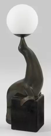 1-flg.; Bronze, dunkelbraun patiniert, anthrazitfarbener Marmor und weißes, satiniertes Glas. Über rechteckigem Sockel vollplastische Darstellung eines Seehundes, den kugelförmigen Lampenschirm auf seiner Schnauze balancierend. Elektrifiziert. Ges.-H. 70,5 cm.