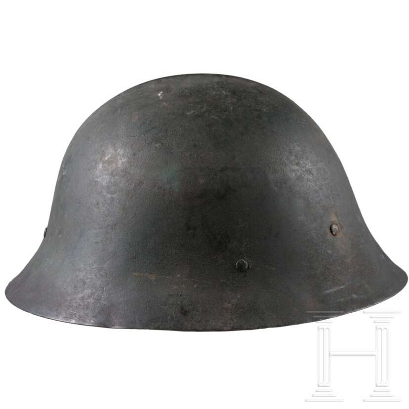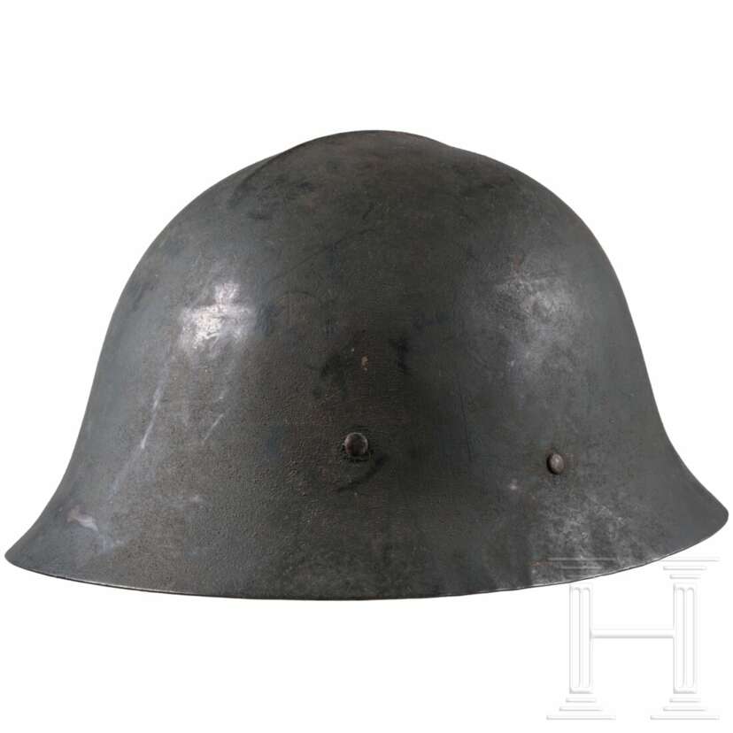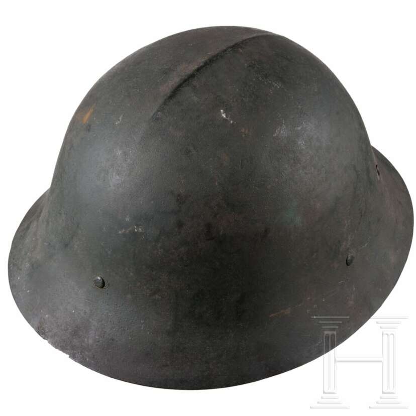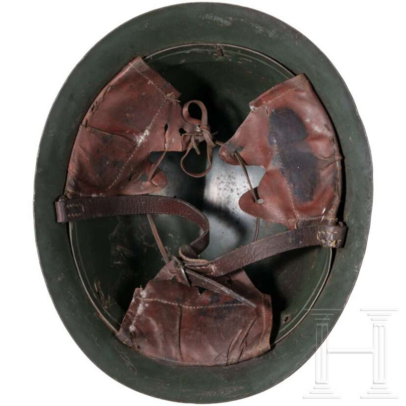 Originallackierung, komplett mit Lederlaschenfutter und Kinnriemen. Alters- und Tragespuren.