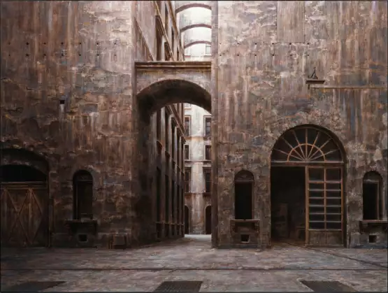 Zu einer anderen Version dieses Werks schreibt Hoenerloh: "Der Versuch, eine perspektivische Situation fast ohne Dreiecke und stürzende Linien zu erzeugen, kann nur zur Verwendung frontaler Wände führen. Aber die dann fehlende Liniendynamik muss ersetzt werden, in diesem Fall durch 11 Rundbögen und das Element der Reihung. Zum Titel: Die 1996 von Damien Hirst zersägte Kuh, die auf den Namen: 'Some Comfort gained from the Acceptance of the Inherent lies in Everything' hörte, wurde fälschlicherweise in einem Kunstkatalog als 'The Acceptance of the Inherent lies in Everything' abgedruckt, was nun zu dieser Art von Geschichtsfälschung führt. Wenn genügend oft der falsche Eintrag wiederholt wird, kann er zur Realität werden. Die Reihung der formalingefüllten Glaskästen findet sich als Zitat in den Brückenbögen wieder, aber eine Kuh ist weit und breit nicht zu sehen. So wie im Werk von Damien Hirst das Innere der Kuh sichtbar war, kann man hier ins Innere des Hauses schauen, was sonst in keinem Bild vorkommt.". Ein Initialpunkt für Hoenerlohs fiktive, menschenleere Stadtlandschaften dürfte sein kurzes Studium 1979 bei Peter Ackermann an der Akademie der Bildenden Künste gewesen sein, der bereits zuvor Architekturmotive verfremdet hatte; bereits Mitte der 1980er Jahre fand Hoenerloh zu seinem eigenen, grisailleartigen Stil und Themenkreis, den er seitdem konsequent weitergeht: rein künstlerische, ins Surreale gesteigerte und verfremdete, mystische Stadtarchitekturvisionen, die trotz gewisser Brüche überzeitlich zu sein scheinen. Sie spiegeln seine Vorliebe und Faszination für historische Baustile wider - Palladio, Piranesi, Schinkel, das Berlin des 19. Jhs. und das von Georges-Eugène Haussmann geprägte Pariser Stadtbild. Mischtechnik/Hartfaser. R. u. monogr.; Verso vom Künstler bez., betitelt u. dat. 2001-2003 mit Ortsangabe Berlin. 118,5 cm x 153 cm. Rahmen.