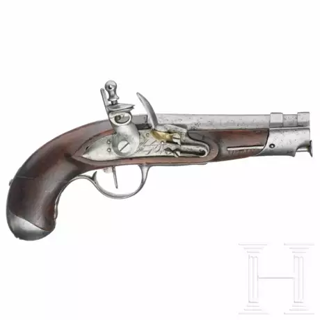 Oktagonaler, in rund übergehender Lauf mit glatter Seele im Kaliber 15,5 mm. Links über der Kammer gemarkt "812", vor dem Hahn "Maubeuge Manufre Impériale". Steinschloss mit rückwärtig gewölbter Schlossplatte. Walnussvollschäftung mit eiserner Garnitur und eisernem Ladestock. Restaurierter Kolbenbruch. Länge 25 cm.