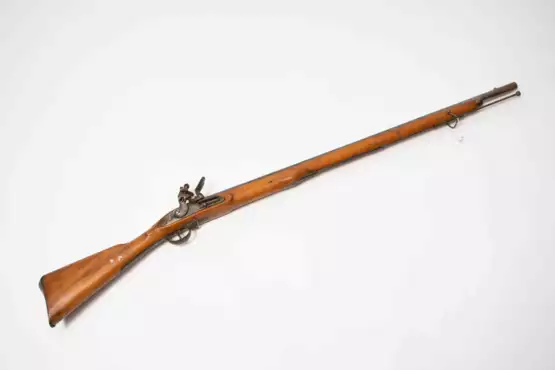 Wohl Preussen od. deutscher Kleinstaat, um 1780, Infanteriegewehr ähnl. M 1732/1740. Korr. Rundlauf (L 100,2 cm), Kal. 18 mm, mit Korn. Laufoberseite mit bekrönten Abnahmestempeln und Ziffern "4" und "12". Schlossplatte flach mit Marke "Löwe als Schildhalter links neben bekröntem Wappen mit "FR". Hahn bombiert, wohl nach franz. M 1777 ergänzt. Schlossgang gut funktionstüchtig. Messinggarnitur. Restaurierter und wieder vernachlässigter Nussbaum-Vollschaft. Eisenladestock. L 139 cm.
