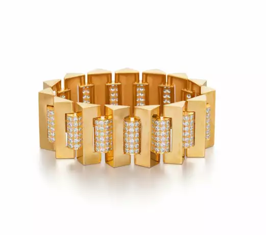 Description: Signed "gh". Bracelet made of sculptural links that fan out around the arm. The links alternate between triangular prisms and half-cylinders set with brilliant-cut diamonds.