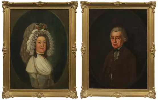 Gegenstücke. Zwei ins Oval gesetzte Darstellungen der o.g. Urgroßeltern. Der Herr mit Alongeperücke und in einem feinen, braunen Justaucorps, darunter eine Weste in gleicher Farbe. Die Dame ebenfalls mit Alongeperücke, darüber eine prächtige Spitzenhaube, „Fontange-Haube“ oder "Haube à la mère de famille" genannt, mit Blumen bekrönt. Ein Klebezettel auf der Rückseite aus dem Jahr 1859 identifiziert das Ehepaar: "Urgoßvater Carl Gottfried Semper, Professor zu Landshut/geboren 19 Dez. 1729, derselbe gestorben 29 Juni 1794 (Julie Semper 1859)" und "Urgroßmutter Maria Rosina geb. Heydrich. geb. 14 April 1745/gest. 8 Januar 1815 zu Landshut (Julie Semper 1859)". Öl/Hartfaserplatte. 45 cm x 34 cm. Rahmen.