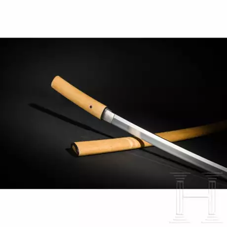 Klinge Shinogi Zukuri, Ioiri Mune, O-Kissaki mit leichtem Kaeri. Hamon Suguha mit feinem Nioi, Konuka Hada. Silberplattiertes Habaki. Nakago Ubu mit einem Mekugi-Ana. Signiert "Hizen kuni Yoshimune" (Yoshimune, Hizen Provinz). In Shirasaya. Länge K/M 70,2 cm, Gesamtlänge 98,5 cm.