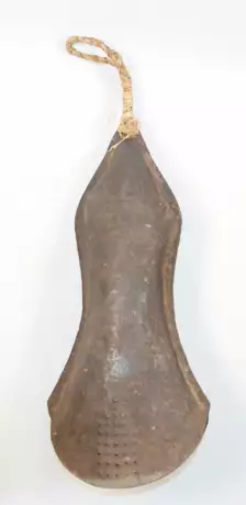 Eisengong mit Bastgewebe. Gong in Form einer Grapbase. Punktueller getriebener Dekor. L: 45 cm.