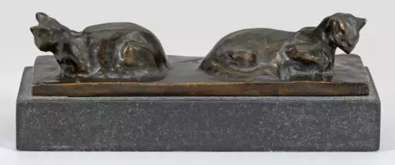 Bronze, braun patiniert. Sign:, Schwarzer Marmorsockel. Typische Kleinbronze des bekannten französischen Malers, Grafikers und Bildhauers, der vor allem durch seine Plakate, speziell für das Kabarett "Le Chat noir" und die gleichnamige Zeitschrift berühmt wurde. Steinlen, der mit Toulouse-Lautrec befreundet war, hatte eine besondere Vorliebe für Katzen, die er unermüdlich in allen Variationen malte und in vielen reizvollen Bronzeplastiken darstellte. Ges.-H. 7,5 cm. L. 20,5 cm.