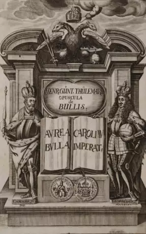VD 17 3:309950K; Heitjan, Bencard 106; Pütter II, 401; vgl. ADB XXXVIII, 159 ff. - Dritte Ausgabe, die erste Frankfurter bei Bencard. Davor Heidelberg 1682 u. Speyer 1687, später als "Opuscula de bullis" veröffentlicht. Die Kupfertafel und 44 der Textkupfer gehören zum dritten und wichtigsten Teil: "Copia manuscripti aureae bullae Caroli IV quod in Bibliotheca Caesarea Vindobonensi invenitur". Ohne das erst später beigefügte Gedicht am Schluss von Tl. 4. - Wasserrandig, teilweise etwas gebräunt u. stockfleckig, stellenweise stärker. Frontispiz mit Einriss im Kopfsteg mit Archivband hinterlegt. Titel unten eingefaltet.