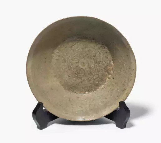 Korea. Steinzeug mit celadongrüner, craquelierter Glasur. Im Spiegel eingeschnittener, floraler Dekor. D 17,5 cm. Mit Holzständer.