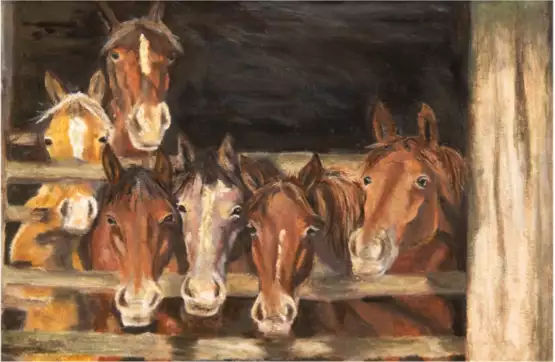 Los 222 | Tiermaler des 19. Jh. "Pferde aus dem Stall schauend", Öl/Lw., unsign., 1 Hinterlegung, 64x90 cm, Rahmen