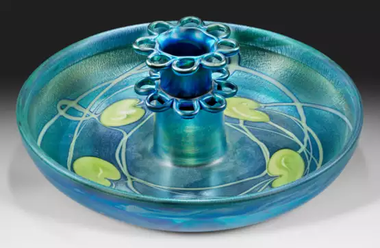 Runde Schale, gemuldet, zentral besetzt mit einem Zylinder mit herausnehmbarer Einsteckvase "Flower Frog". Grünblaues Favrile-Glas, Oberfläche irisiert in silbergelben und perlmutterfarbenen Tönen, dekoriert mit cremefarbenen Einschmelzungen in Band- und Seerosenblätteroptik. Sign. L. C. Tiffany Favrile mit Nr. 1456M und 1684. Zylinder sign. "L. C. T. Favrile" mit Nr. 1785 und minim. best.; H. 4,5 cm - 10 cm. Schalen-D. 25,5 cm.