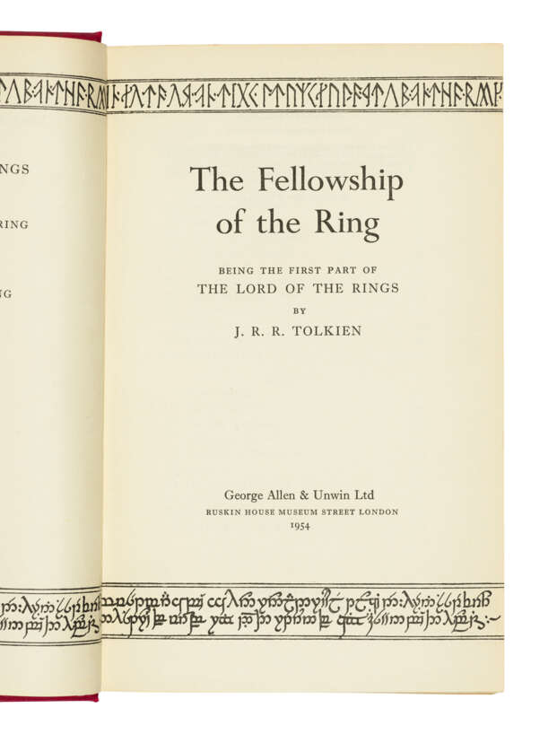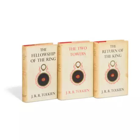 3 volumes, octavo. Half-titles, each volume with map printed in red and black tipped in at rear (faint thumbmark to the verso of the folding map in The Return). Original red cloth (covers slightly bowed in The Fellowship and The Return, minor rubbing to corners, two tiny red inkspots to fore-edge of Two Towers, light ghosting and cockling to endleaves of Two Towers and The Return); original pictorial dust jackets printed in red, black, and gold (small dampstain to upper jacket of The Return, toning to spines, short tears and chips at extremities); housed in a custom slipcase.