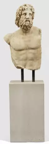 Torso of Asklepios. Contemporary copy (marble cast or stone cast) after the ancient Greek marble head in the National Archaeological Museum in Athens. Mounted on stone base.