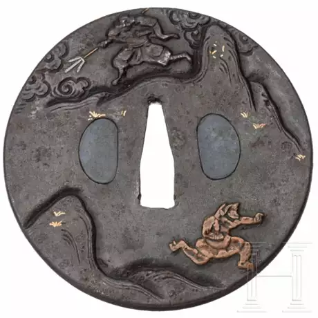 Eiserne Tate Maru Gata Tsuba im Stil der Yakushi-Schule mit Darstellung eines Samurai, der einen Oni in einer Berglandschaft jagt. Kotsuka und Kogai Hitsu mit Shakudo verschlossen. Maße 8,5 x 8 cm.