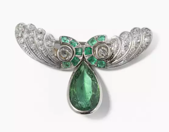 750 Weissgold. Stilisierte Flügel mit je einem Altschliff-Diamanten von ca 0.15 ct. begleitet von acht wohl Smaragd-Carrés über einem Turmalin-Tropfen von ca 6 ct. L 4x3 cm, 12 g.