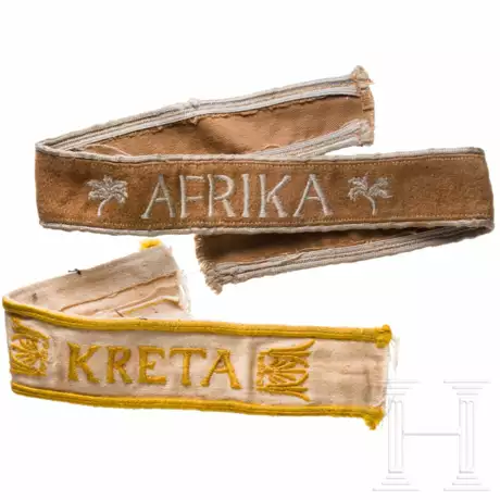 Ärmelband AFRIKA, Länge 43 cm, lokale Fertigung. Ärmelband KRETA, Länge 22 cm, von der Uniform abgenommen. Alters- und Tragespuren.